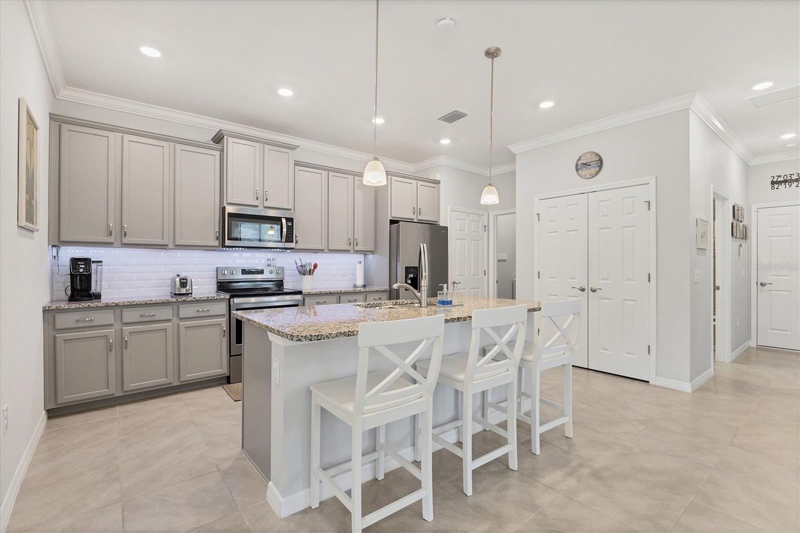 Under contract-accepting backup offers. Waterfront Move-in Ready in the Heart of Wellen Park. This newer 2/2 +FLEX ROOM home offers a bright, spacious, and highly upgraded interior located on a cul de sac with a preserve front view!! Multiple upgrades include: tile roof, sealed pavers, crown molding, and smart light switches with dimmers. The kitchen includes stainless steel appliances, granite countertops, pantry, subway tile backsplash, soft-close cabinetry, and under-cabinet lighting—perfect for everyday living and entertaining. An open great room with dedicated dining space is filled with natural light and opens to a private enclosed lanai overlooking a peaceful water view. The primary bedroom features his-and-hers closets, dual sinks and a large walk-in shower. The guest bedroom comfortably fits two twin beds or easily accommodates a queen. Outside, the home offers an additional paver area ideal for grilling plus solar walkway lights. Additional upgrades include four upgraded ceiling fans with lighting, a SimpliSafe security system, smart lock and video doorbell, epoxy-coated garage floor, garage overhead storage, hurricane shutters, and the convenience of a newer home. Located in a gated Wellen Park community, residents enjoy a heated pool, clubhouse, fitness center shuffleboard and a secure mailbox—all with low HOA fees and CDD included within the property taxes. A short distance to CoolToday Park, shopping, dining, medical facilities, and just a short drive to the Gulf Coast beaches. Move-in ready, highly upgraded, and ideally located—this home offers the best of Florida living. add this link in your URL for a short video. https://cmsphotography.hd.pics/20628-St-Kitts-Way/idx