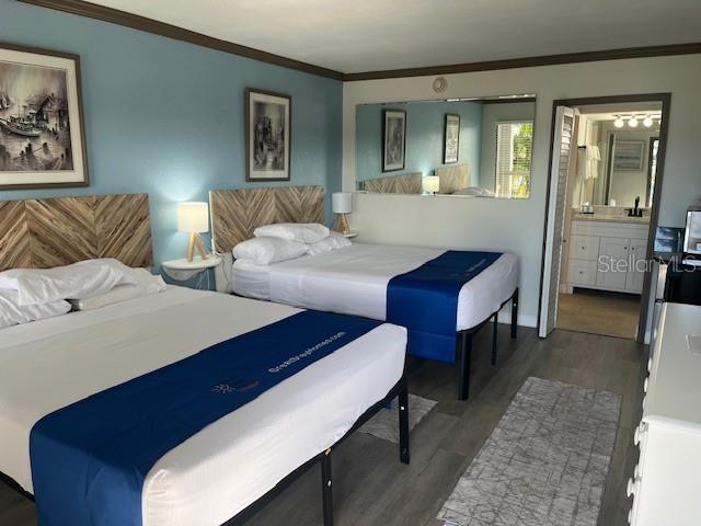 WATER-VIEW condo-hotel room located within the Ramada by Wyndham. Enjoy the view from this 2nd LEVEL residence overlooking the lush landscaping, wide canal and boat activity of this waterfront resort. This privately owned condo-hotel residence may be rented daily and short-term with no minimum lease restrictions. Rent it or use it as much as you like! This room would be the PERFECT CABANA FOR BOATERS! Dock in front of your room when available and keep your boat in the Marina that surrounds the hotel. After a full day of boating enjoy the hotel amenities; including a heated pool, newly renovated Tarpon Bay Grill & Tiki Bar, on-site breakfast room, free coffee bar, arcade, fitness center and community laundry room. Unit C-233 is furnished with two queen beds, a large dresser, mini-refrigerator, microwave, and a low-rise bistro set. The renovated bathroom features stone countertops, updated cabinetry, and modern fixtures. Located approximately two miles north of Sarasota/Bradenton International Airport and minutes from Downtown Sarasota dining, shopping, art galleries, and entertainment. Close proximity to some of the area’s most popular beaches including Lido, Longboat , Siesta Key, and Coquina Beach. Monthly Condo fees include all utilities, Electric, Water, Sewer, Trash, Cable, Internet, Phone, exterior maintenance, and interior common areas.