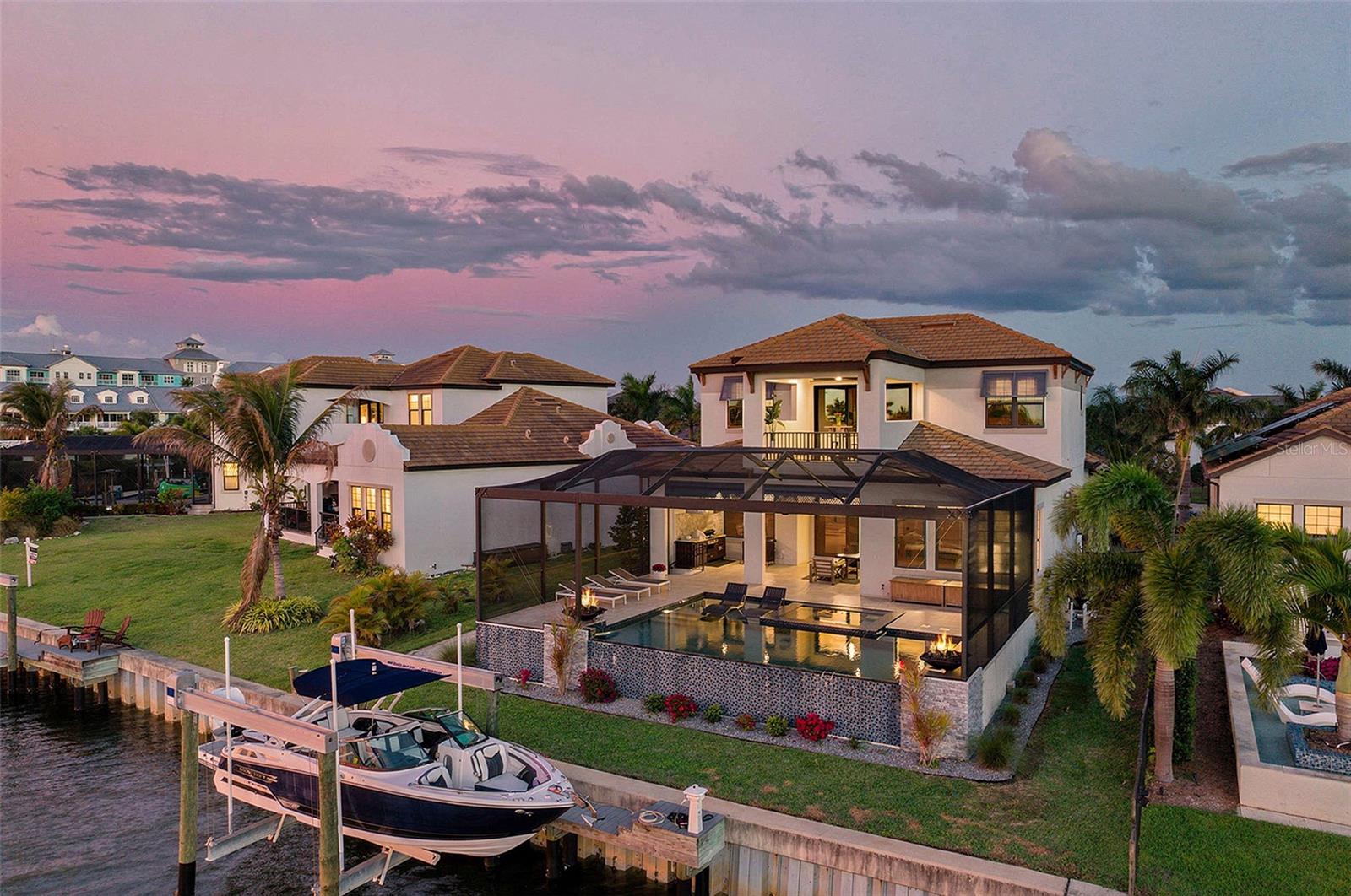 WATERFRONT LUXURY IN SOUTHSHORE YACHT CLUB | TRUE BOATER’S PARADISE THIS is where elevated coastal living meets effortless indoor-outdoor design in one of Tampa Bay’s most sought-after waterfront communities. 4 BEDROOMS | 3.5 BATHROOMS | HEATED SALTWATER POOL & SPA | ELECTRIC BOAT LIFT | IMMEDIATE TAMPA BAY & GULF ACCESS | EV CHARGER | WHOLE HOUSE GENERATOR | PRIMARY ON MAIN This thoughtfully designed home offers 4 bedrooms with a primary suite on the first floor, creating the perfect blend of comfort and convenience. Upstairs, you’ll find a spacious bonus loft, a massive balcony overlooking the marina, and a second (dual) primary suite with en-suite bath, along with two additional guest bedrooms and another full bath—ideal for hosting family and guests with ease. All interior doors upgraded to solid core doors and ALL WINDOWS AND DOORS ARE HURRICANE IMPACT GLASS. Perfectly positioned on a deep-water canal with no bridges to open water, this property offers direct access to Tampa Bay in minutes and features a 16,000 lb boat lift with remote (2022)—ideal for serious boaters and yacht enthusiasts alike. The true showpiece is the resort-style outdoor living space, designed for year-round enjoyment. A fully enclosed screened lanai opens seamlessly through expansive sliding glass doors, creating a stunning indoor-outdoor experience. Enjoy a custom Bull outdoor kitchen with gas, granite countertops, sink, and refrigerator, elegant travertine flooring, rich teak wood ceilings, and a striking living wall feature. The stunning pool area is perfectly oriented to capture sunlight all day (east to west exposure) and is enhanced with fountains and fire features for an elevated ambiance. The home's private HEATED SALT WATER POOL AND SPA is heated with electric and features a built in sun shelf. Inside, the home features upgraded finishes and smart home technology throughout, including quartz countertops, designer cabinetry, tankless water heater, WHOLE-HOUSE GENERATOR, whole-home reverse osmosis system, and integrated smart controls. Additional highlights include an EV CHARGER and epoxy garage floors, high-efficiency HVAC system, R30 insulation, and built-in pest control system. Beyond the home, Southshore Yacht Club offers a true resort-style lifestyle with unmatched amenities, including two pools, hot tub, two waterfront restaurants, private beach, tennis, pickleball, bocce ball, shuffleboard, corn hole, two clubhouses, two fitness centers, fire pits, private pier, and boat-up docks. Enjoy watching manatees and dolphins from your backyard, take a quick boat ride to St. Petersburg in just 15–20 minutes, or catch F-35 flyovers on game days from your outdoor living space. This home does require flood insurance; however, it is elevated and experienced no water intrusion during 100-year storm events, offering additional peace of mind. This is more than a home—it’s a rare opportunity to own a fully integrated waterfront lifestyle in one of Tampa Bay’s premier coastal communities.